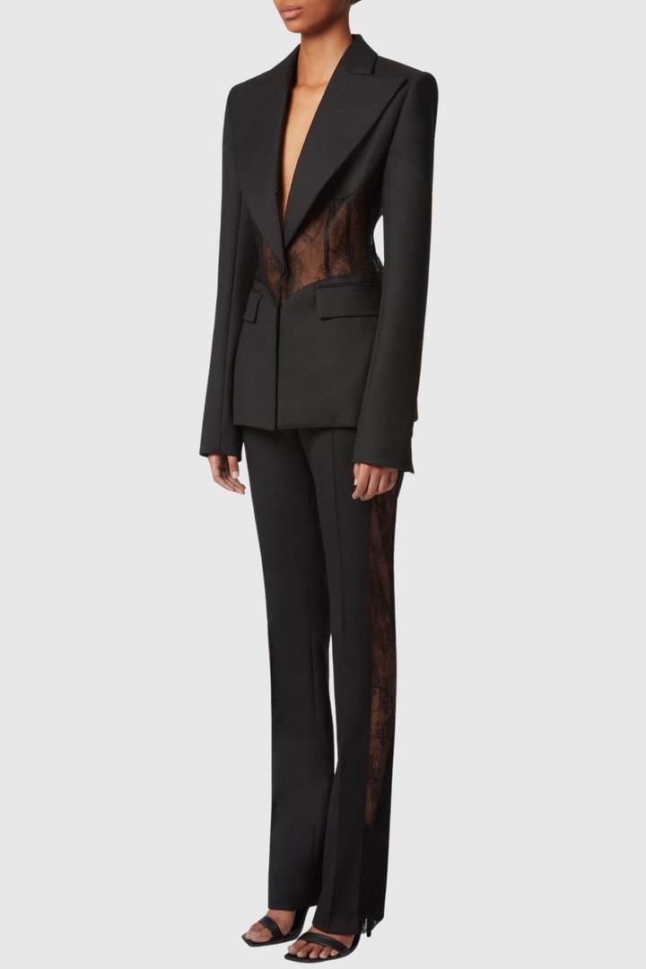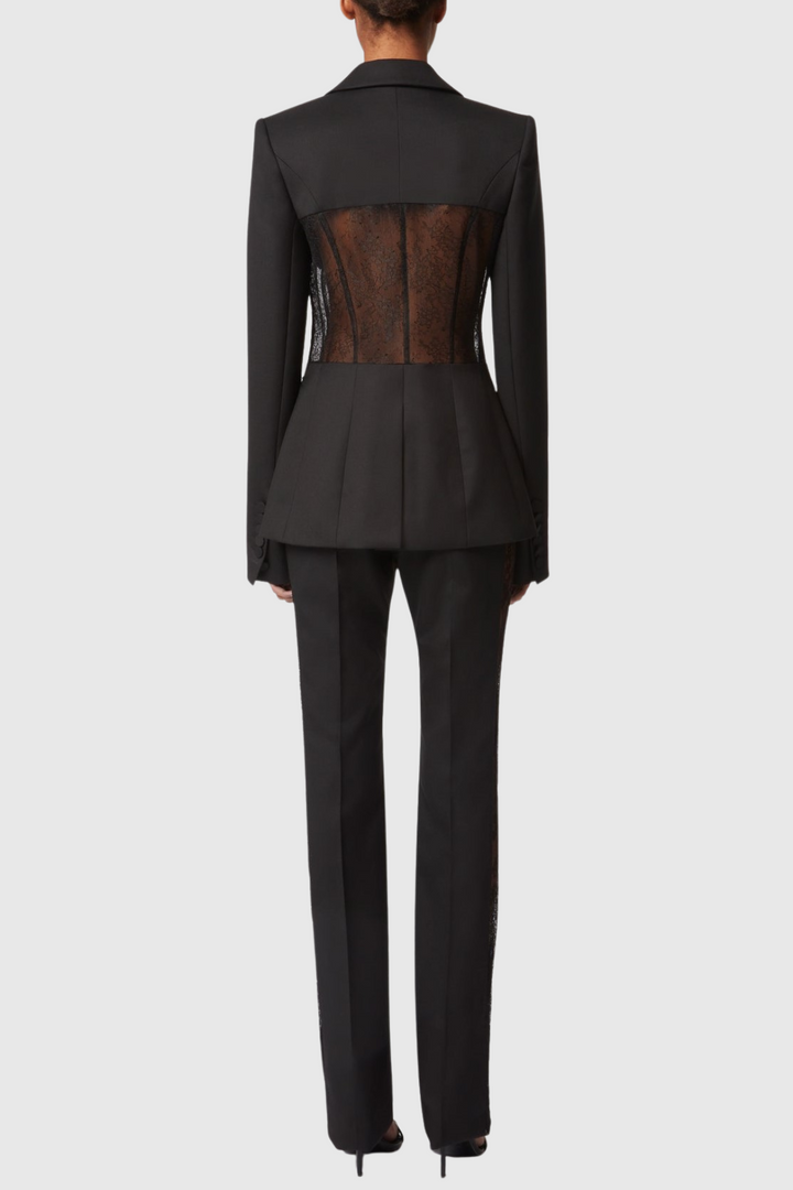 Elevate your wardrobe with the Aedin Lace Corset Blazer, a refined fusion of classic tailoring and delicate lace detailing. This blazer contours the silhouette with a corset-inspired design, offering a flattering and structured fit. Ideal for both formal occasions and chic evenings, it adds an elegant edge to any outfit while maintaining a sophisticated poise. Crafted to enhance confidence and style, the Aedin Lace Corset Blazer redefines modern elegance.