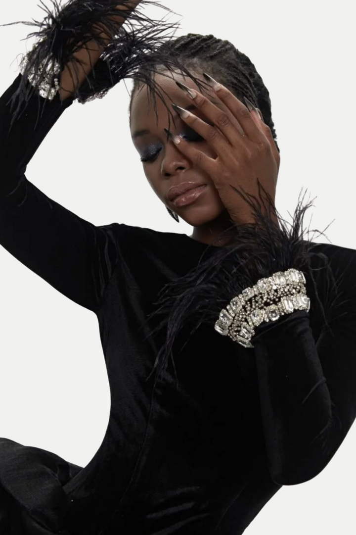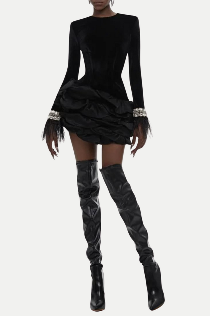 Step into luxury and glamour with our Aruba Rhinestone Feather Mini Bandage Dress! This dress features a stunning rhinestone design and delicate feather trim, perfect for a night out. Made with soft velvet fabric, it offers comfort and style. Elevate your wardrobe with this one-of-a-kind piece!