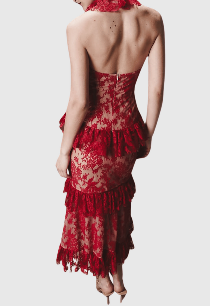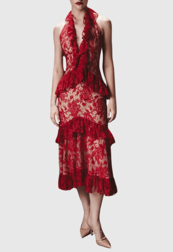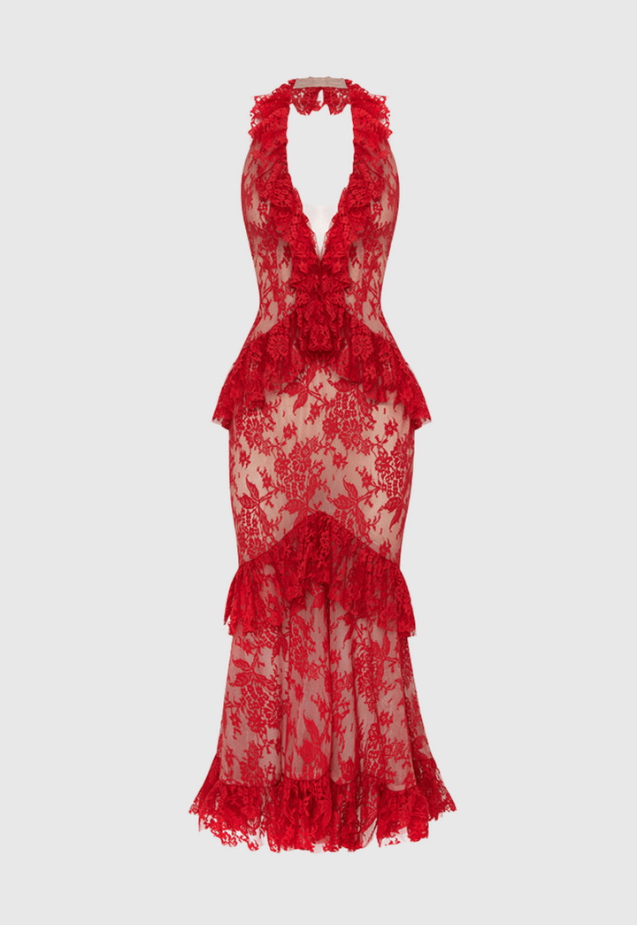 Carolynne Lace Halter Ruffle Midi Dress