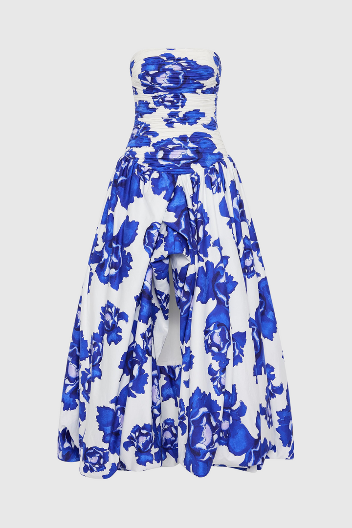 Coleka Floral Print Strapless Ruched Maxi Dress - Blue