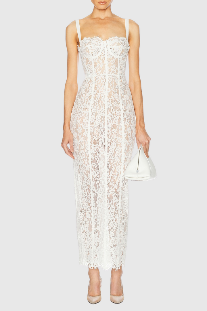 Elevate your evening attire with the Jalana Lace Corset Midi Dress. This sophisticated silhouette combines delicate lace detailing with structured corset styling for a refined yet alluring aesthetic. The midi length offers versatile elegance, transitioning effortlessly from cocktail events to formal gatherings. Meticulously crafted to enhance your natural contours while maintaining graceful composure.