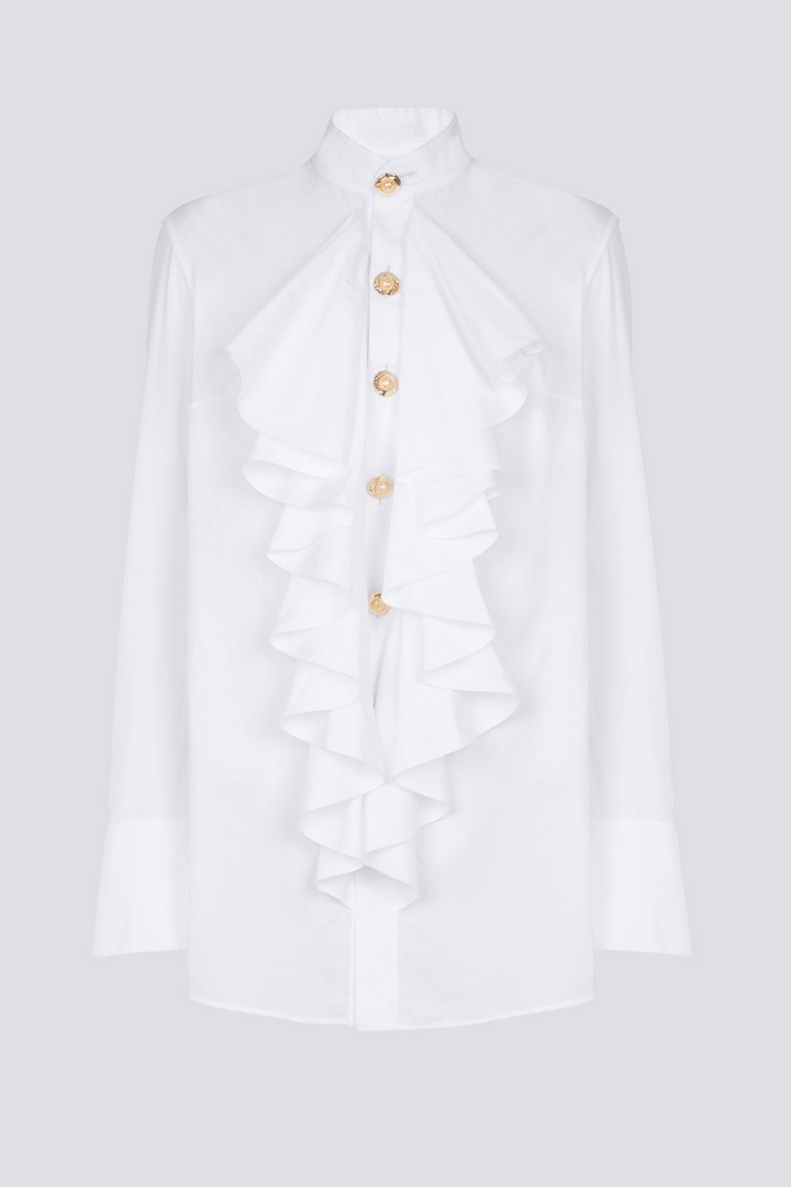 Elevate your wardrobe with the Kania Ruffle Shirt, a refined piece that blends classic elegance with modern flair. Its delicate ruffle details add a touch of sophistication, while the tailored fit ensures a flattering silhouette. Perfect for both professional settings and stylish evenings, this shirt delivers effortless grace and versatility. Crafted from quality fabrics, it offers comfort alongside its polished look.