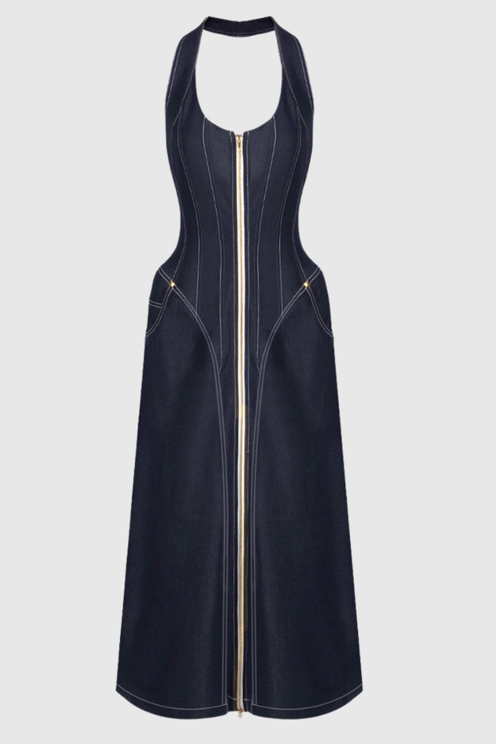 The Krishna Halter Denim Corset Contrast-stitching Maxi Dress blends structured tailoring with relaxed denim texture. Featuring a fitted corset bodice and halter neckline, it offers flattering support and an elegant silhouette. The contrast stitching highlights the dress's design details, while the maxi length delivers a sophisticated, elongated look suitable for versatile occasions. Crafted for those who appreciate expert construction and contemporary style.