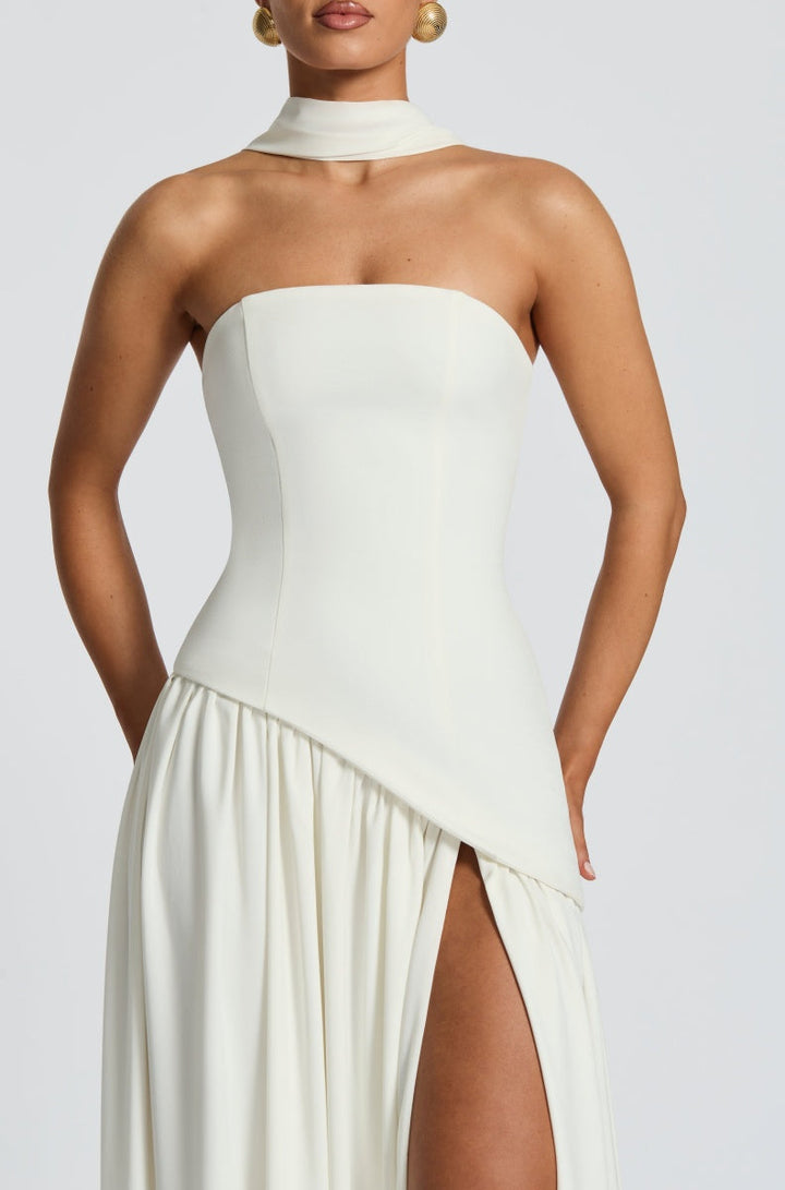 Elevate your eveningwear with the Miloni Strapless Split Maxi Dress, designed for graceful sophistication. This elegant piece features a strapless neckline that accentuates your shoulders, paired with a daring side split that adds movement and allure. Crafted to enhance your silhouette, it offers a refined look perfect for formal events or upscale occasions.