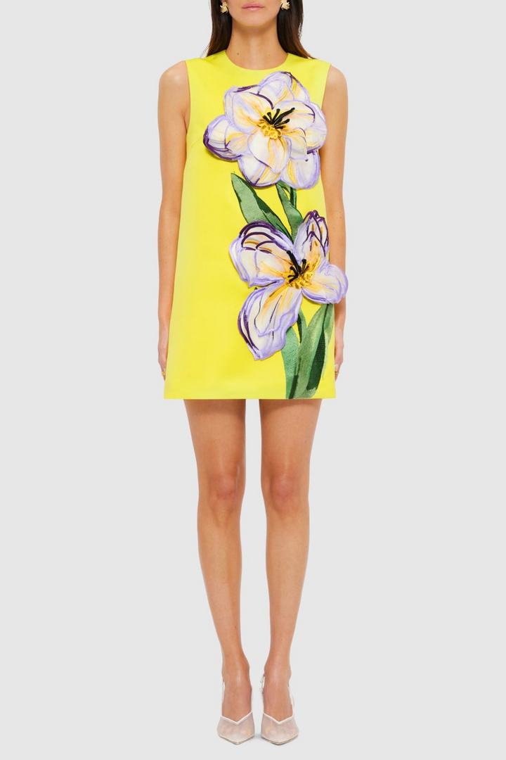 Mimoza Floral Appliqué Sleeveless Mini Dress - Yellow