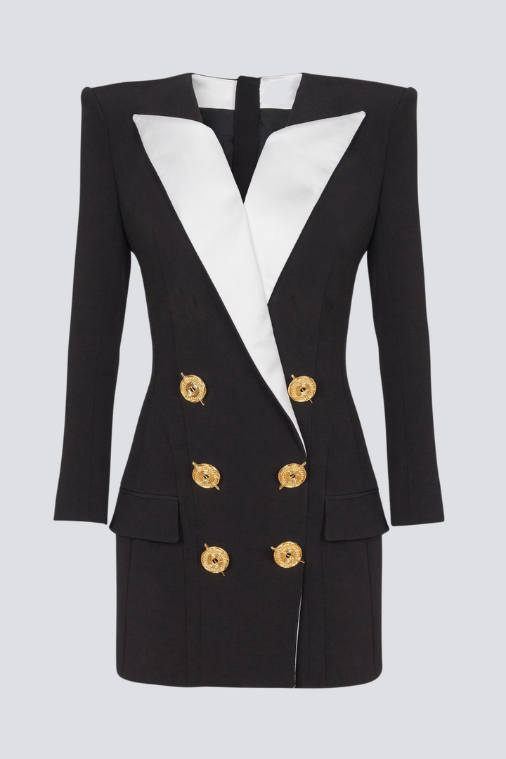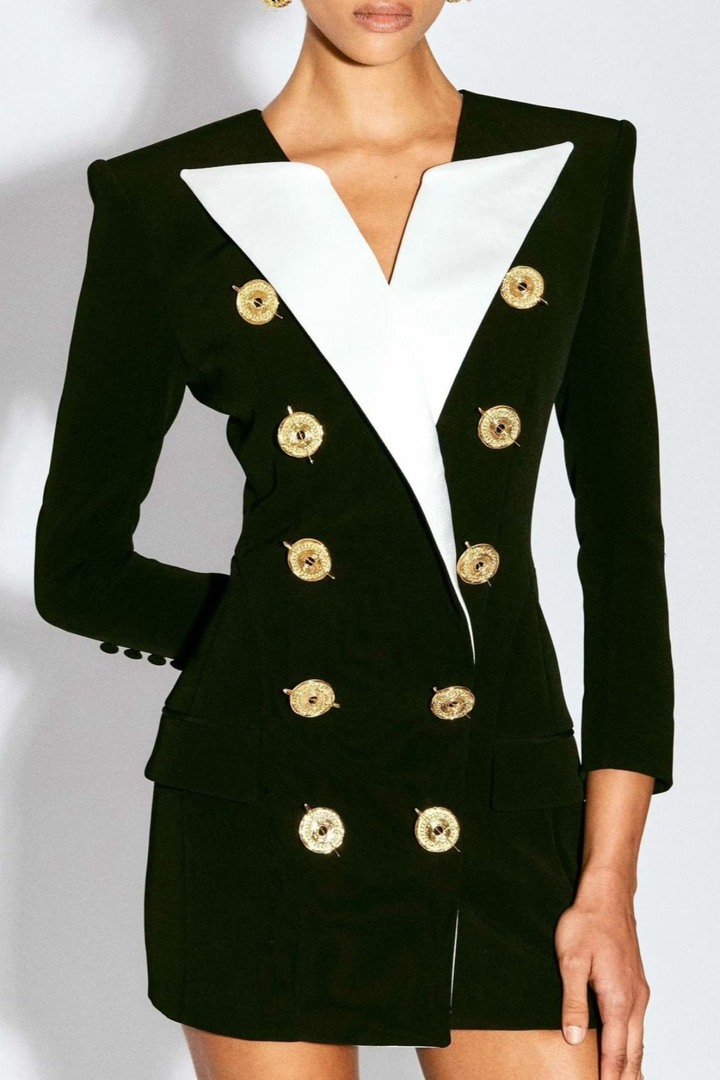 Elevate your wardrobe with the Missouri Double-breasted Mini Blazer Dress, a refined blend of classic tailoring and modern style. Its structured silhouette and double-breasted front create a polished look, while the mini length adds a contemporary edge. Perfect for making a confident statement at any event, this dress offers both sophistication and versatility in one striking piece.
