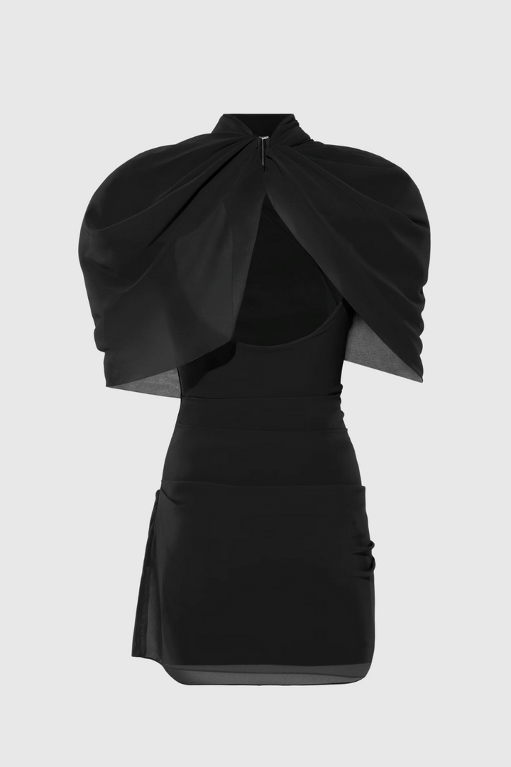 Introducing the Priscilla Draped Mesh Mini Dress, a luxurious and exclusive addition to your wardrobe. This sophisticated black dress features a mesh overlay with delicate draping, creating a truly elegant and tasteful look. Elevate your style and channel a world of art, literature, and fashion with this stunning piece.
