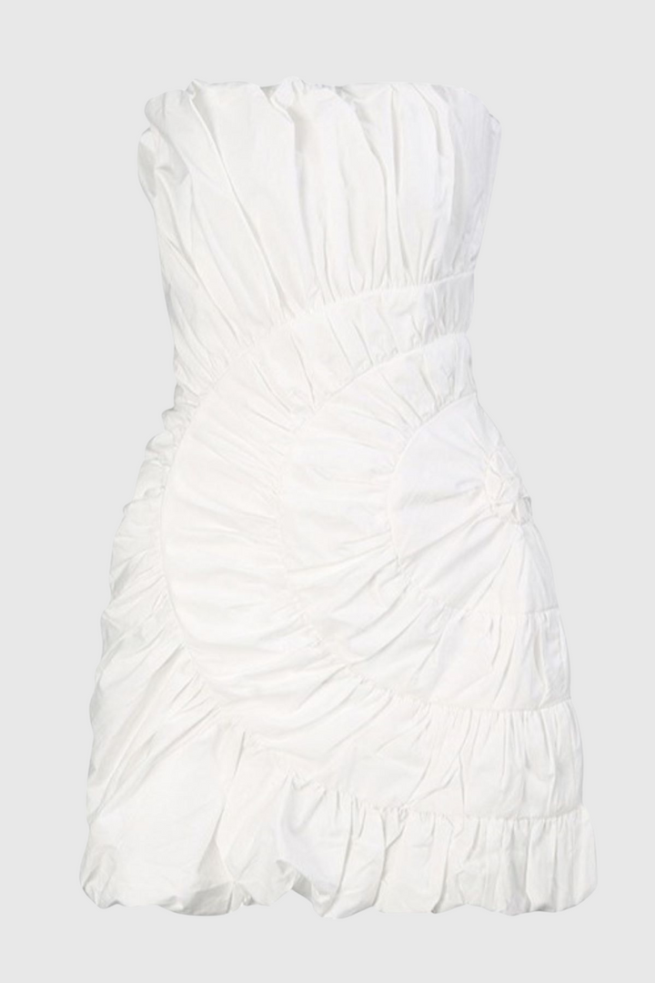Slip into the Tania Strapless Ruched Mini Dress in crisp white and let the fun begin. Its ruched detailing flatters every curve, while the strapless design highlights your shoulders for a flirty, carefree vibe. Perfect for dancing the night away or turning heads at brunch, this mini dress makes every moment feel like a celebration.